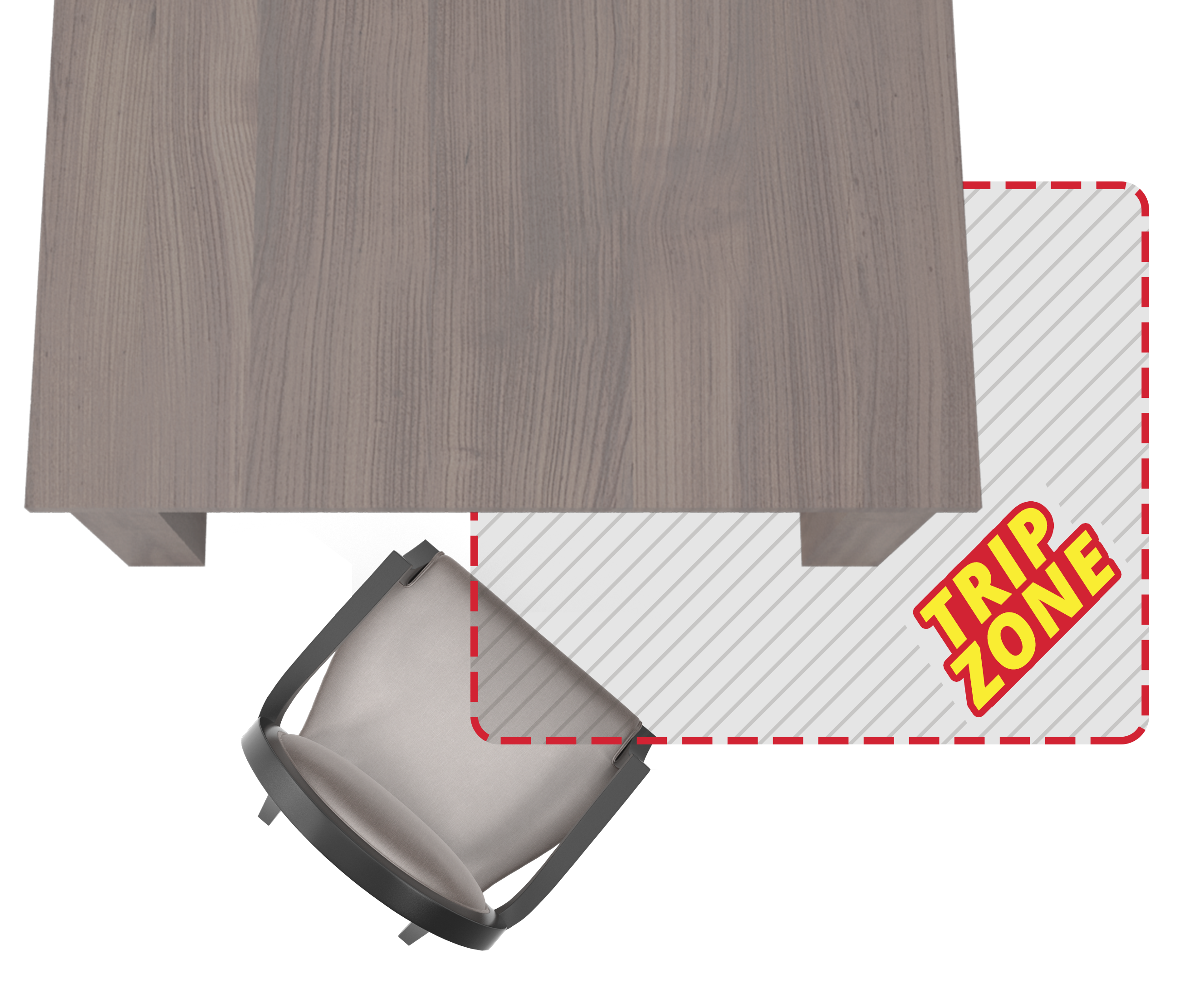 The ‘Trip Zone‘ is the area around the front of the table into which a resident needing assistance must navigate. Trips and falls occur often in this area as both the resident and care staff are expected to: